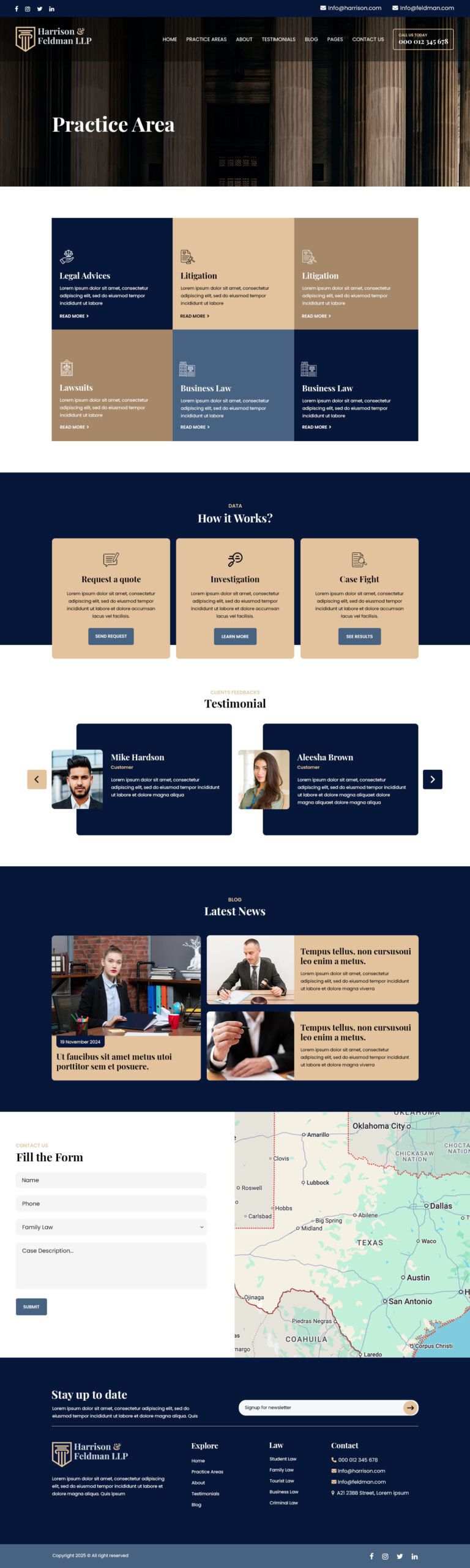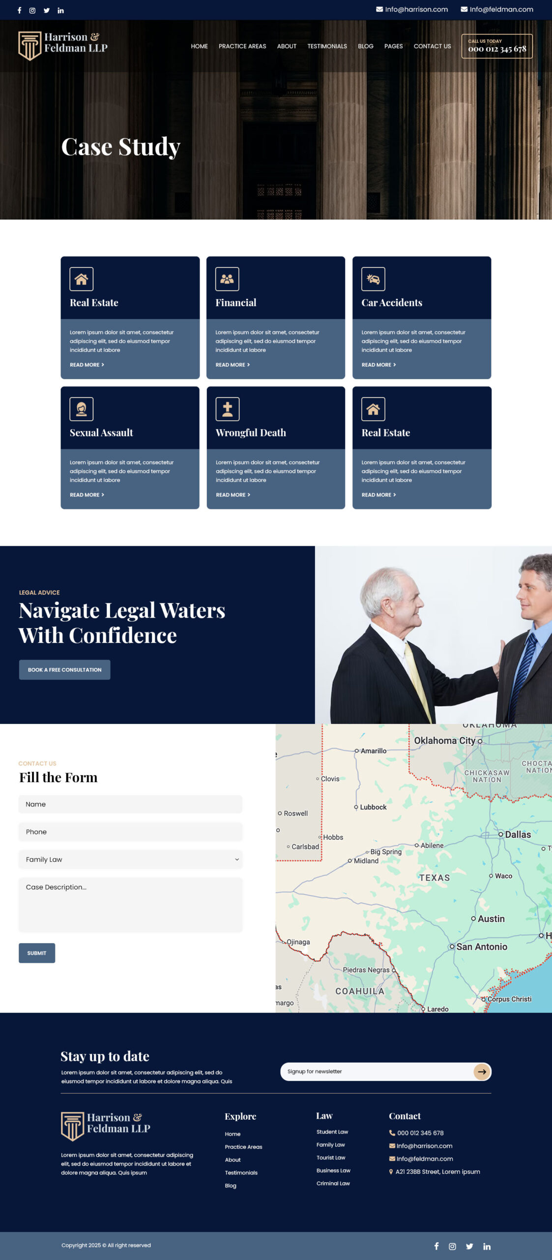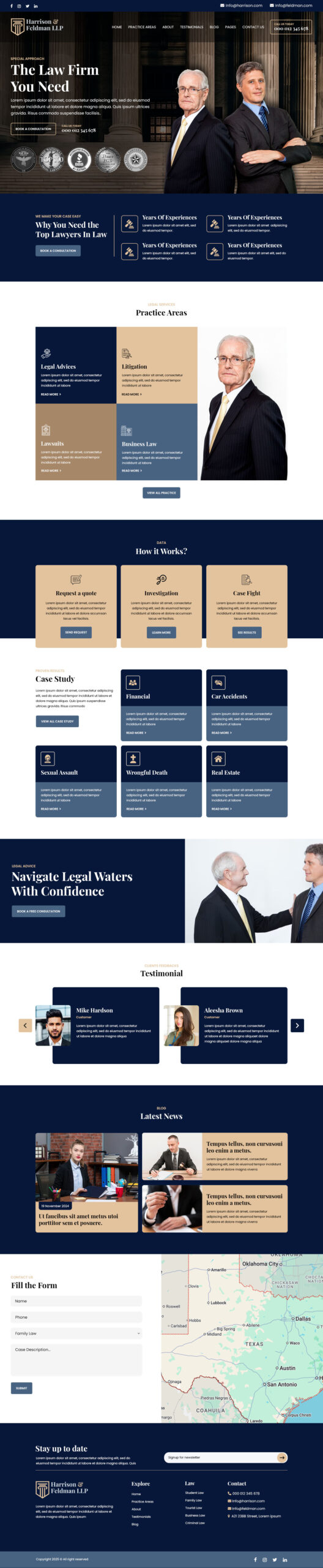 - Includes homepage sections for services, attorneys, results, testimonials, and contact